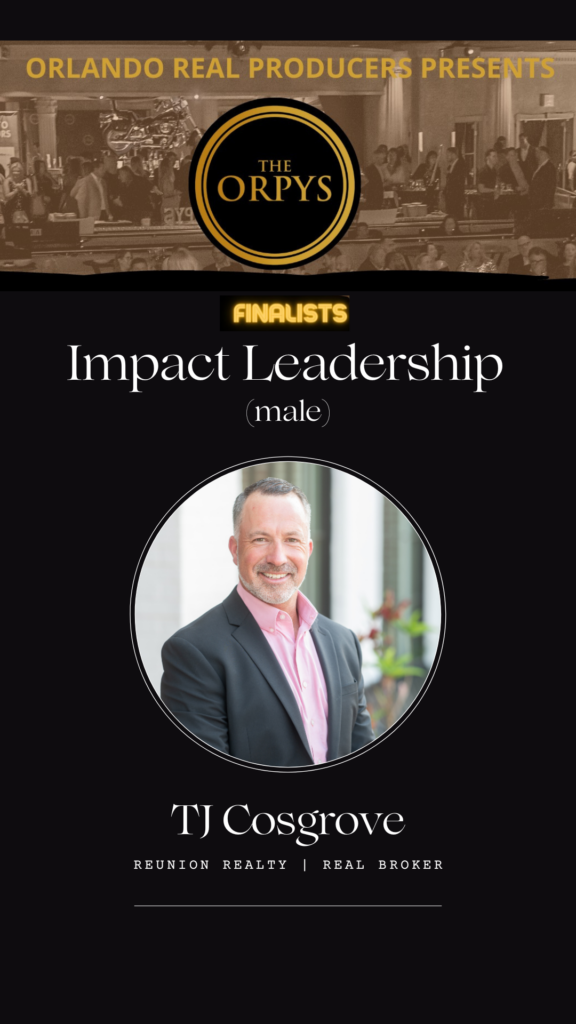 Congratulations to Tj Cosgrove for being announced as a finalist for the Impact Leader award by Orlando Real Producers! It’s truly an honor and a testament to the hard work, dedication, and outstanding real estate efforts that Tj Cosgrove has consistently demonstrated. Being recognized as a finalist and having been featured as a cover star in January 2022 highlights the significant impact he’s had in the real estate industry.